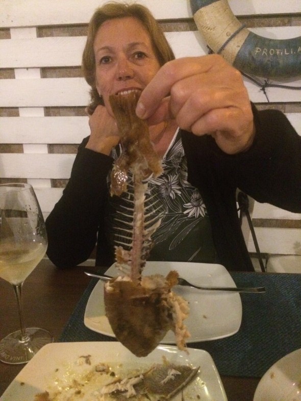 In de avond gaan we heerlijk uit eten aan de vissershaven van Sciacca in de Bottega del Porto. Vis als antipasto, bij de pasta en als gedeeld hoofdgerecht een lokale vissoort, die we niet kunnen thuisbrengen (Praya?). Heerlijk allemaal