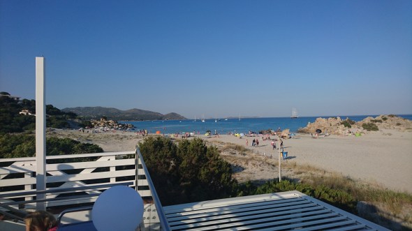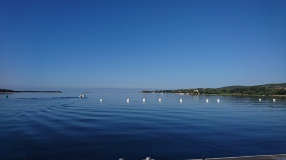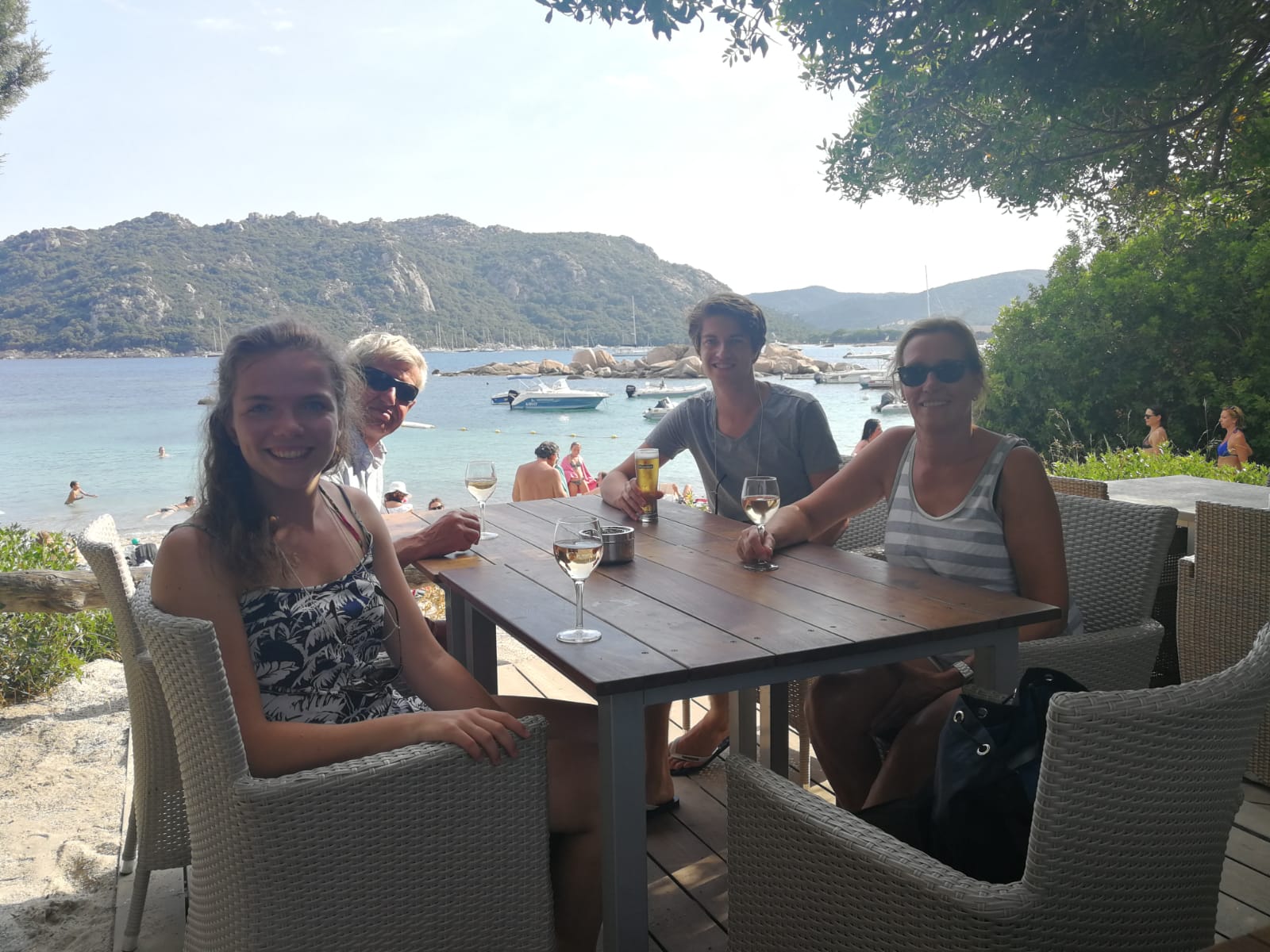 De volgende dag is er nog steeds geen plaats in Porto Vecchio, dus blijven we lekker in de Golfe de Giulia. We laten ons decadent naar het strand brengen door de boat boys die de moorings beheren. Daar kopen we wat lekker Franse zaken, zoals baguettes, croissants, lekkere kaasjes en paté. En we drinken een lekkere “apero” op een mooi en rustig terras aan het eind van het strand.