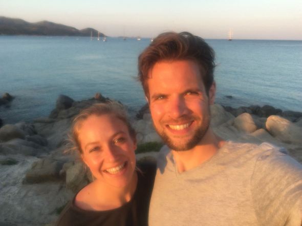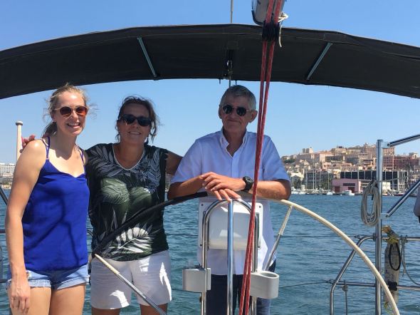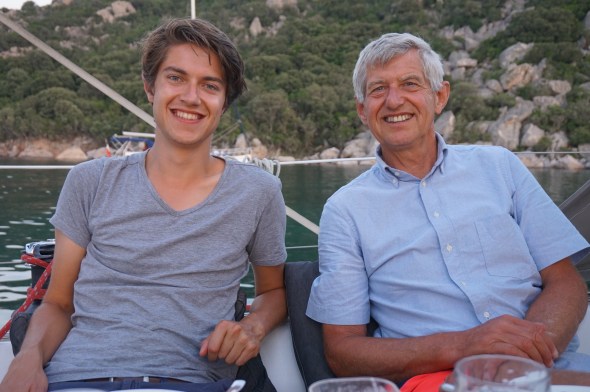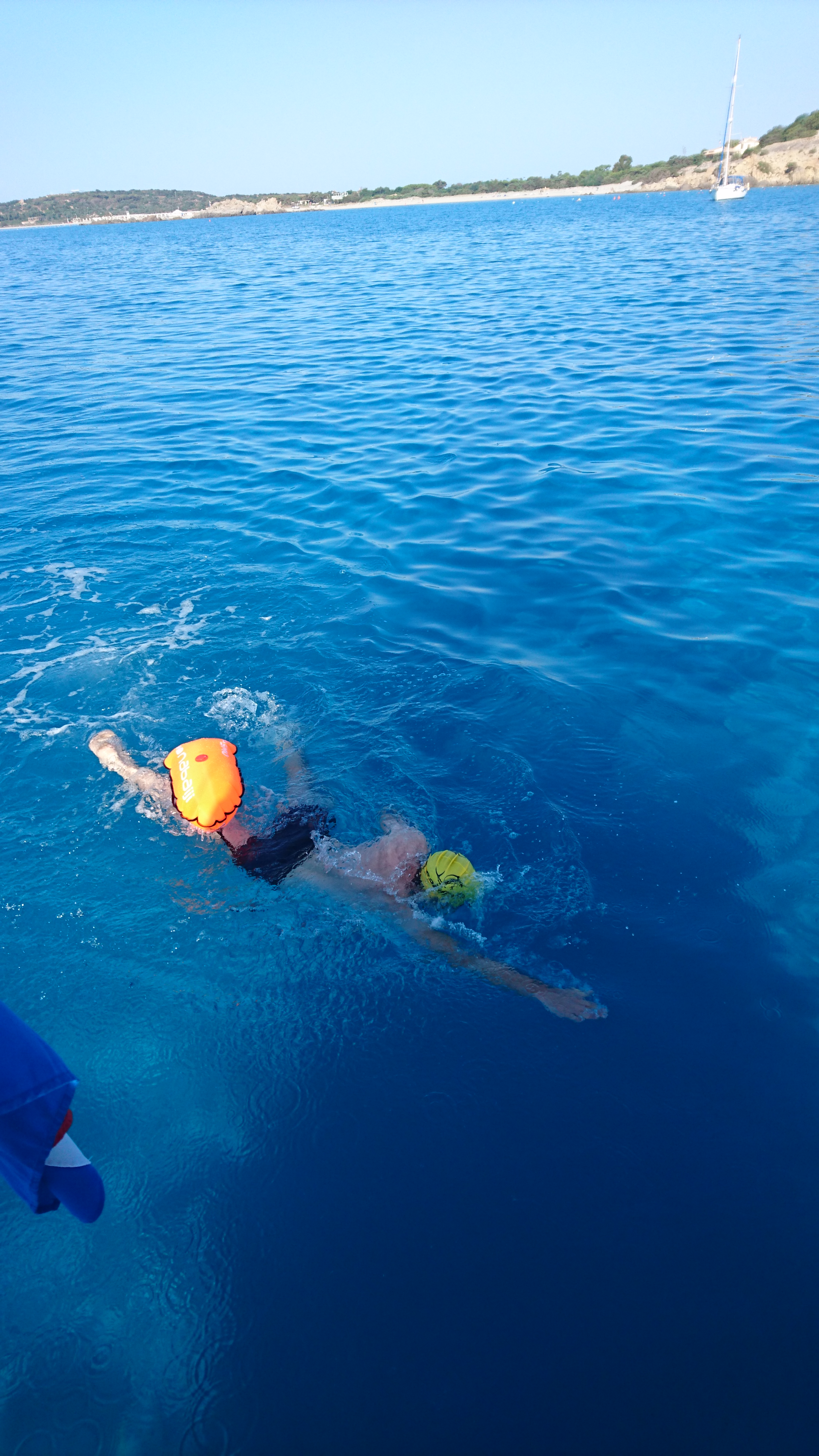 De volgende dag staan Ires en Martijn inderdaad op de steiger om 11:30, dus Ryanair heeft zich weer eens goed gedragen. We zeilen diezelfde middag weer weg naar onze eigen Golfe de Giulia, waar we weer aan dezelfde boei komen te liggen. We zwemmen naar de rotsen aan de kust vlakbij, maar het blijkt toch lastiger dan gedacht om daar je staande te houden of erop te klimmen!