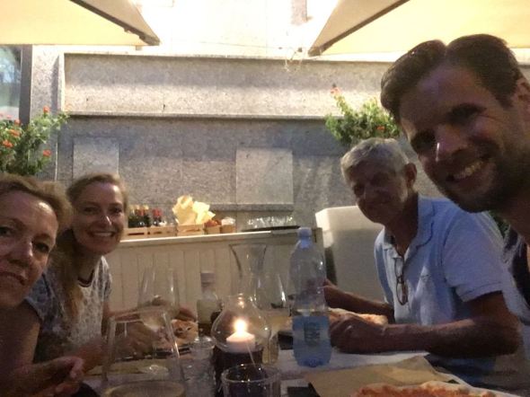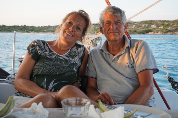 Hier komen Bianca en Rob aan boord. We maken er een gezellige avond van en eten heerlijk in het restaurant waar we vorig jaar ook al waren met Milou en Lennard.