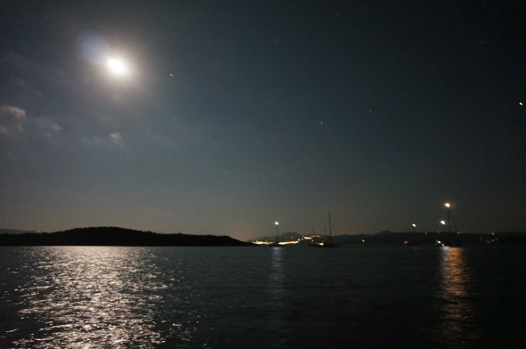 In deze baai draait de wind naar het westen, puur landeffect. We krijgen een mooring, wat wel prettig is omdat de verwachting is dat de wind eerst weer terug draait naar het oosten en dan in de nacht hard uit het westen zal komen. Dat gedraai willen we liever niet achter een anker als het niet hoeft. De mooring service is prima, je kunt zelfs water tanken bij een speciale boei en ze brengen je gratis naar het strand als je op de marifoon daarom vraagt. Het kost minder dan de helft van een plek in een marina.