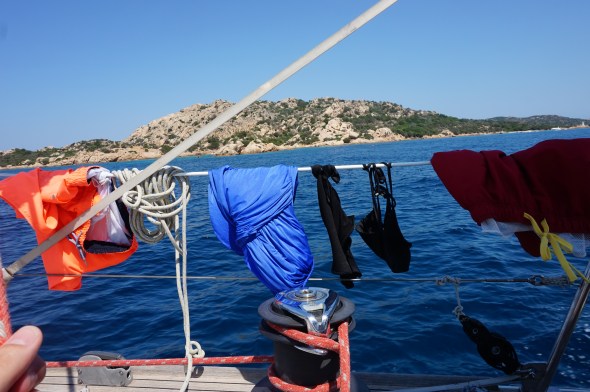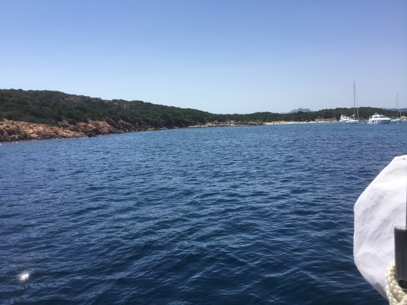 Na het zwemmen en een lekker ontbijtje zeilen we naar Porto Palma (nee, niet op Mallorca, maar een mooie baai voor Isola Caprera). Het gaat hard vandaag, max. 9,2 knopen!