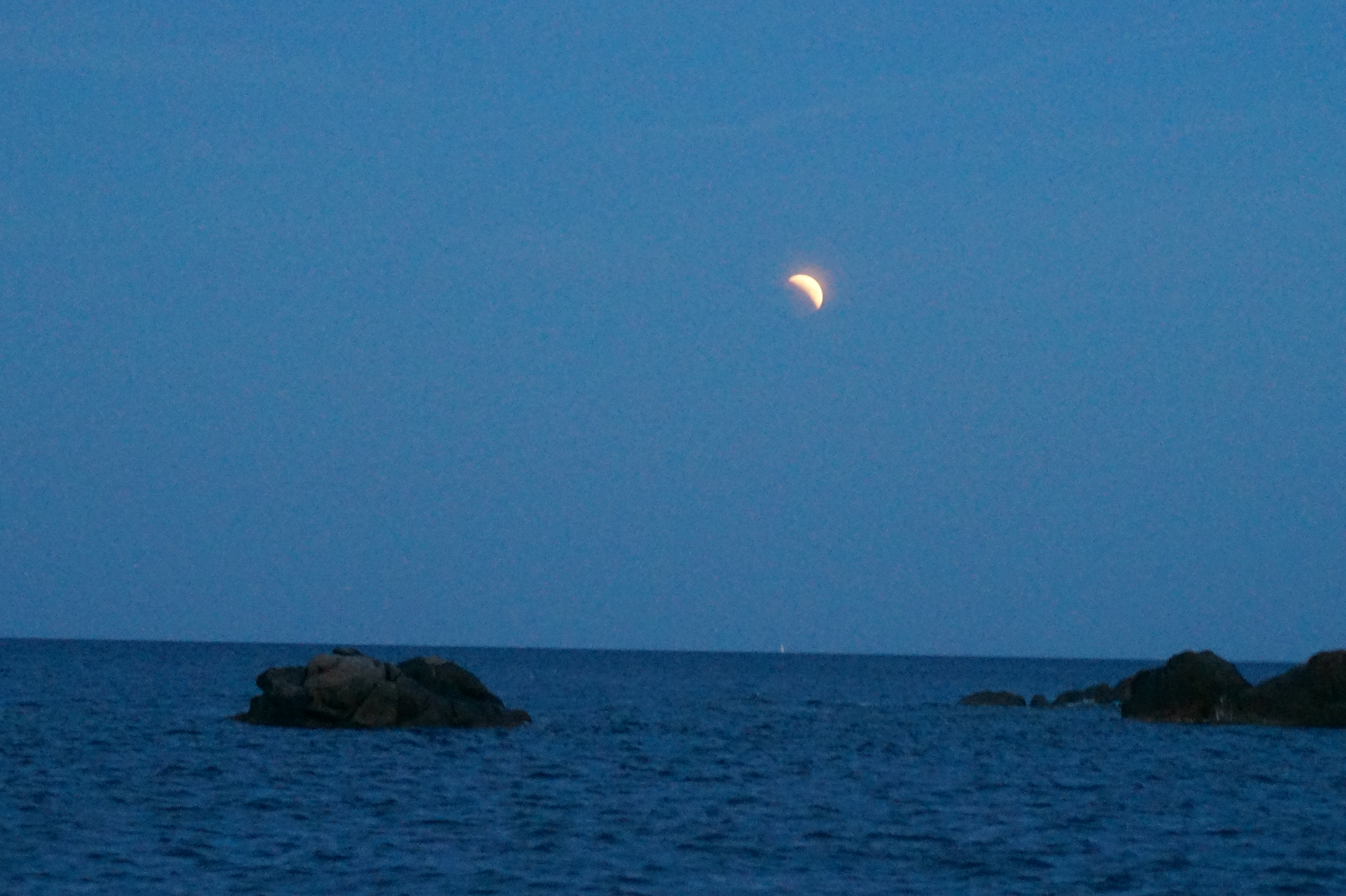 In de avond blijkt hoe strategisch deze positie gekozen is: we hebben vrij uitzicht naar het Oosten, waar de maan eerst in zijn geheel opkomt (het is bijna volle maan) en vanaf 21:30 langzaam wordt verduisterd. Tussen 22:15 en 23:30 is hij volledig verduisterd en als een rode bal te zien. Met de kijker zie je zelfs de diepte en lijkt de maan echt op een bol.