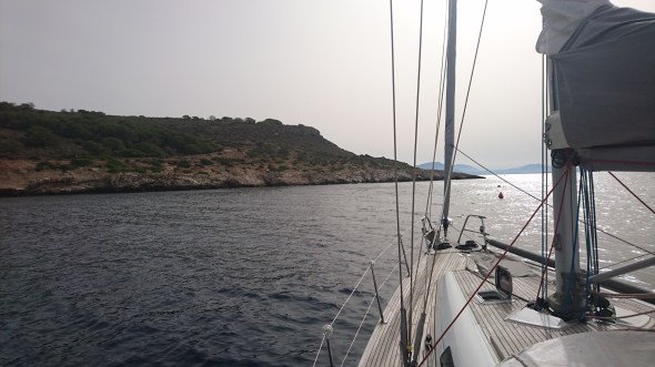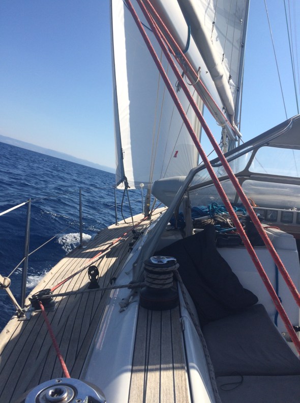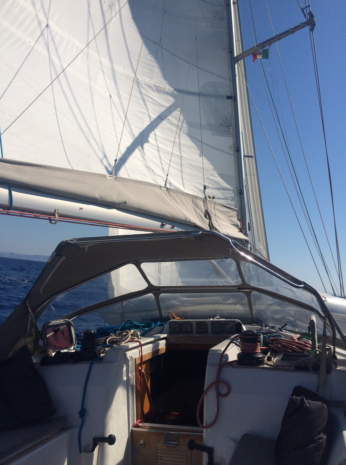 Na een paar uur met de genua op de boom pal west gevaren te hebben, loeven we op tot ‘koers boei’, ofwel Capo Carbonara, 140 mijl verderop.
