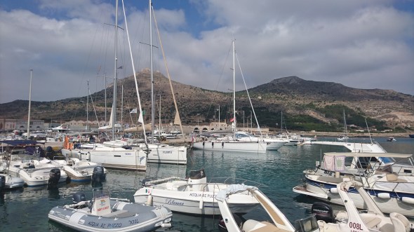 Op 29 juni varen we naar de Egadische eilanden, 60 mijl van Sciacca. Jammer genoeg alles op de motor. We pakken eerst en mooring bij de zuidpunt van Favignana, maar het is teveel lager wal. We verkassen om 18 uur nog 4 mijl naar Levanzo, waar we onder hoger wal kunnenliggen voor de nacht. Heerlijk rustig.