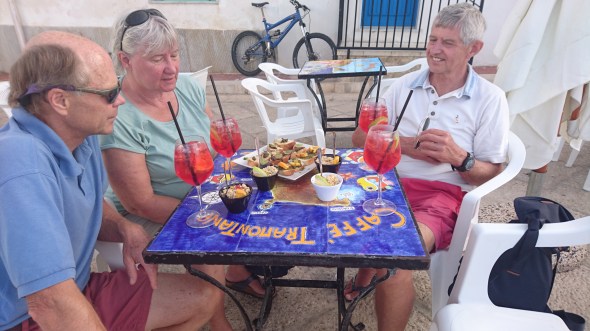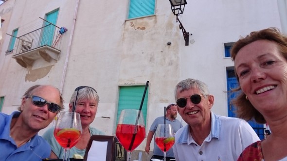Het verhaal achter deze test: In Favignana zijn we gestart met het drinken van Campari Spritz, met Bianca en Rob. Dat beviel zo goed oor ons allemaal dat we ermee doorgingen en e een test van maakten. Elke keer aan de wal drinken we een CS bij een bar o.i.d. Tot nu toe wint Marettimo met een 8,5-9 dankzij de perfecte sterkte ( voor sommigen iets te sterk), de hapjes, de entourage en de bediening. We geven geen deelscores maar alleen een totaaloordeel.