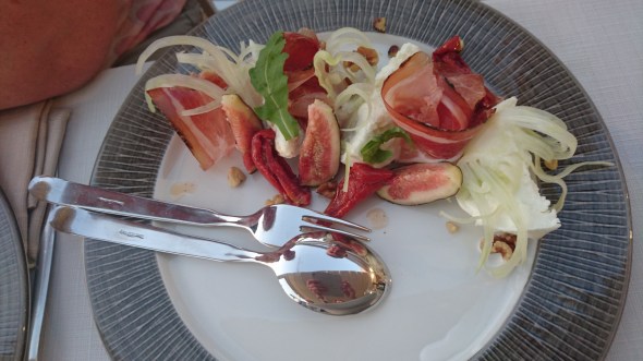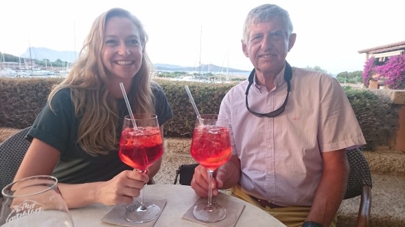 Lekker uit eten in het havenrstaurant, met de eerste fles Sardijnse wijn erbij natuurlijk.