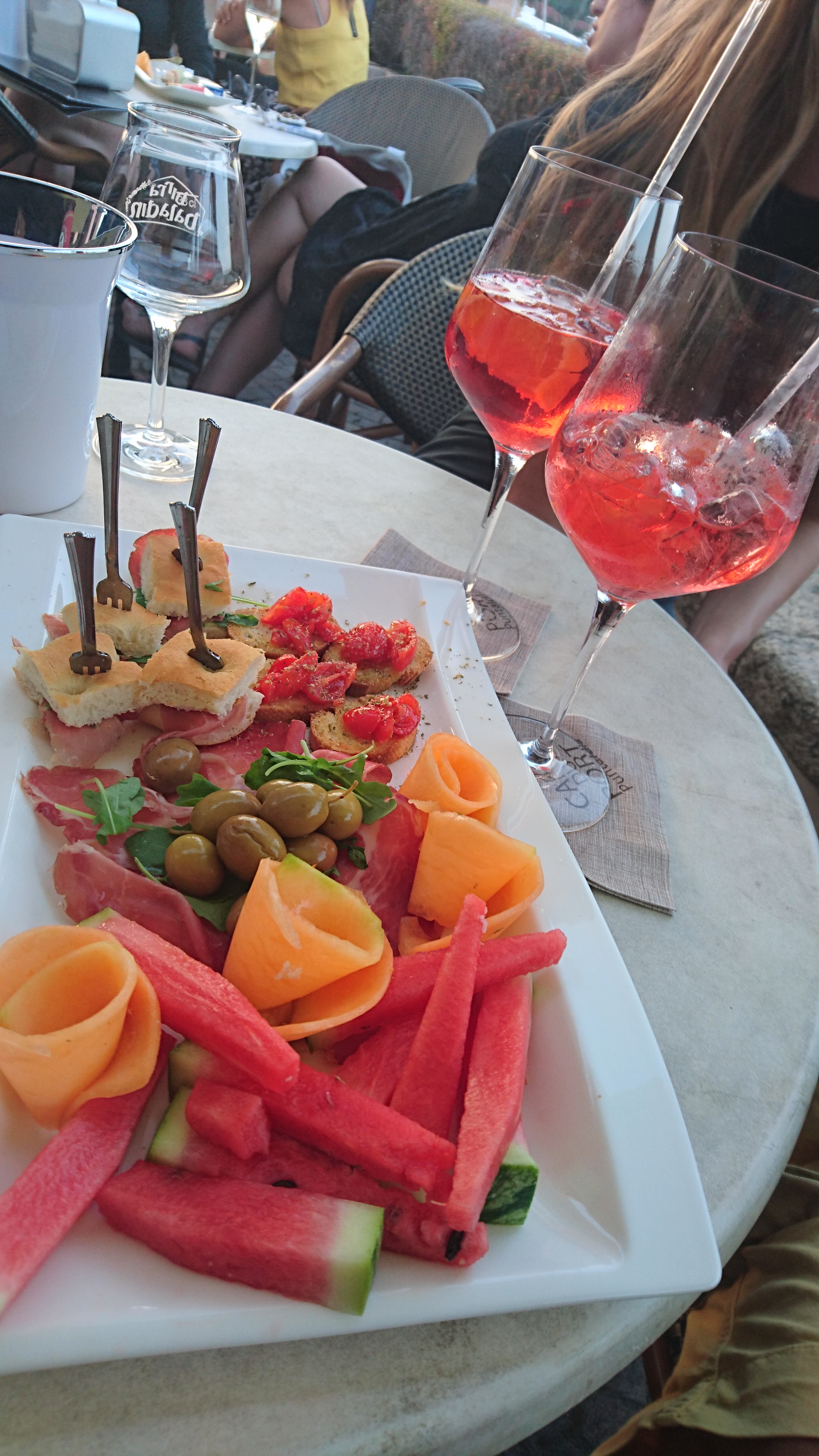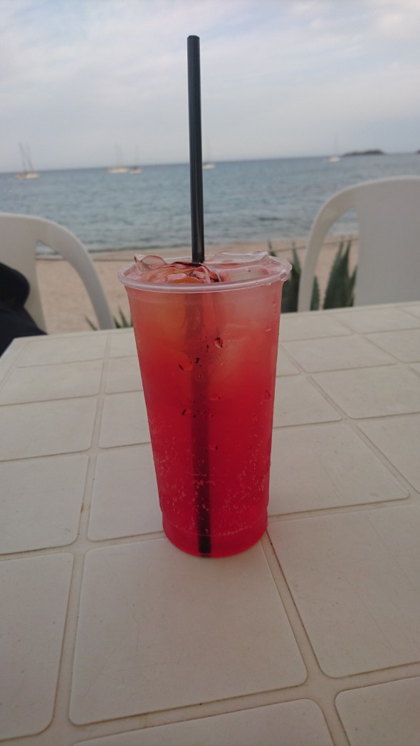 We dronken samen een Campari Spritz op het strand, score 7,5 door het ontbreken van hapjes, maar de sterkte en smaak was dik in orde.