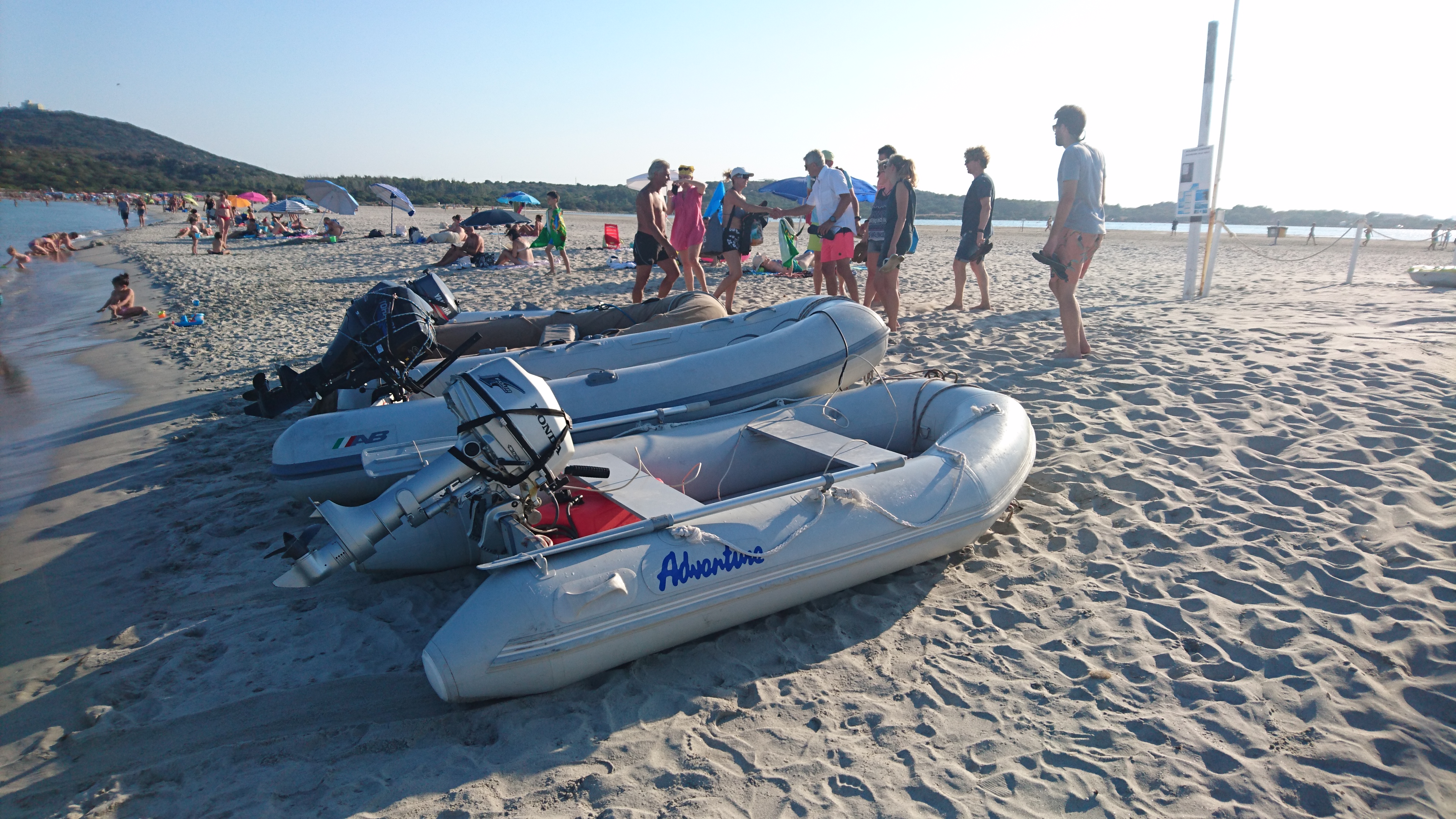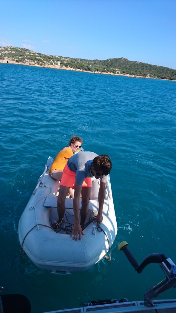 We pakken weer een mooring van AMP (het natuurgebied rond de Maddalena eilanden) want ze willen liever dat je hier niet ankert. We liggen achter alle andere boten, heel rustig. Maar ook tijd om de dinghy te proberen en vooral om te kijken of je met 2 personen kunt planeren met 5 PK. Niet dus….