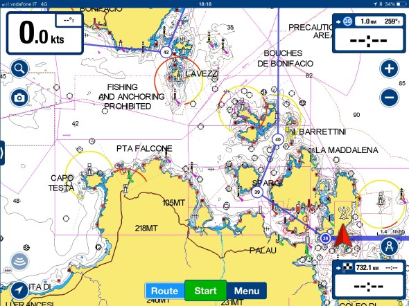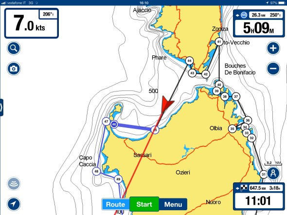 Nu geven we je een overzicht van onze complete route van dit jaar, omdat we zo ongeveer halverwege zijn. In de tweede afbeelding is dit goed te zien. De afbeelding is van de plotter app op de ipad terwijl we vanmiddag van Figari op Corsica naar Castelsardo op Sardinië overstaken.