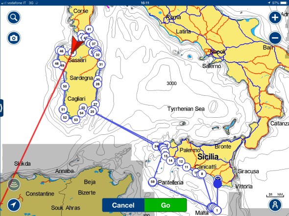 Maar eerst een plaatje van onze route van vandaag, waarin we dus van Figari (punt 44) naar Castelsardo (punt 45) zeilden, 38 mijl in minder dan 6 uur, met max 11 knopen wind en stralende zon. Heerlijk gewoon.