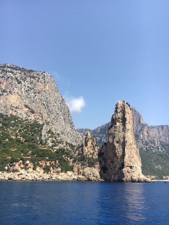 Daarna varen we verder naar het noorden langs de indrukwekkende rotskust met grotten. We gaan na 34 mijl voor anker achter Capo Comino, waar het beter beschut is dan we dachten met ZO wind. De zandgrond is erg hard dus moeten we wel 3 keer ankeren voor we goed liggen.