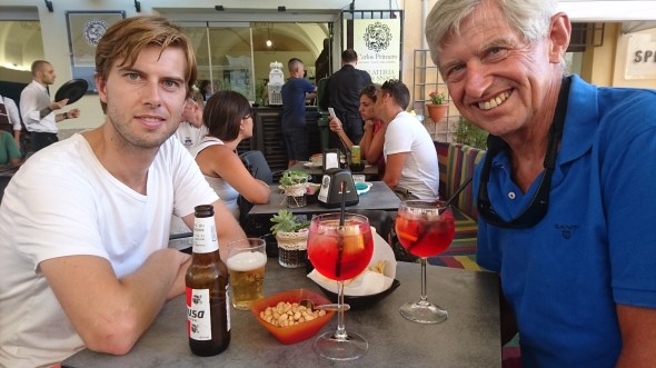 Het campari- en alcoholpercentage verdient een 9, sterker dan in Marettimo. Maar de afwerking is niet precies genoeg. Volgens ons zit er geen prosecco in, maar gewone witte wijn. En de hapjes zijn wat te gewoontjes (chips en pinda’s). Het blijft dus bij een 8. Maar we lopen wel tevreden weg en besluiten ter plekke dat we snel wat meer in onze maag nodig hebben. Op naar de pizzeria dus (zie het vorige bericht).