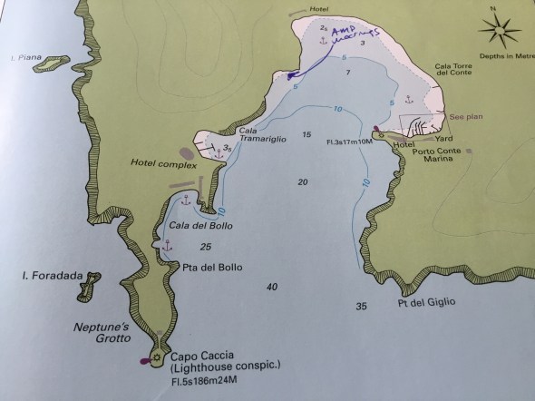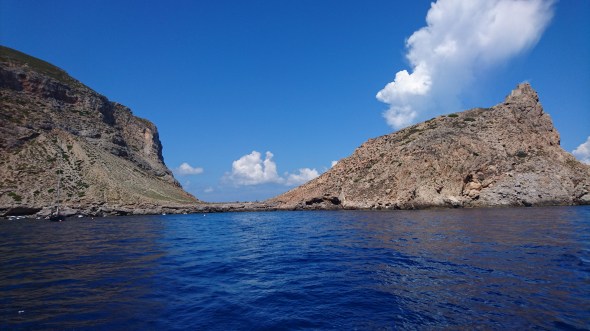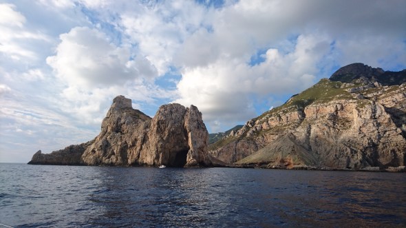Daarna tuffen we nog een uurtje door tot de beloofde zeewind uit NW komt opzetten. Net als gisteren wakkert deze weer aan tot 16 knopen of iets meer dus we zeilen ruime wind heerlijk langs de onherbergzame kust. We hebben stroom mee dus kunnen voordelig gijpen op een hoek van maar 40 graden omdat de stroom ons verzet. We komen precies goed uit vlakbij de grotten van Isola Piano en de grot van Neptunus.