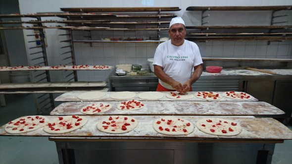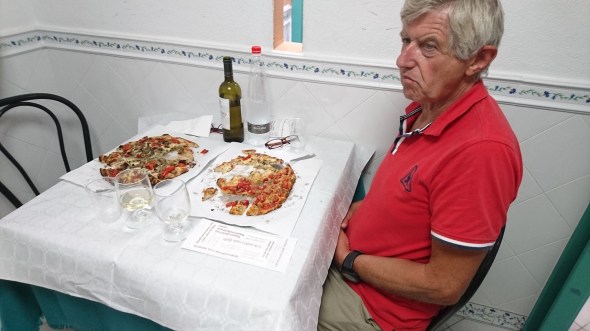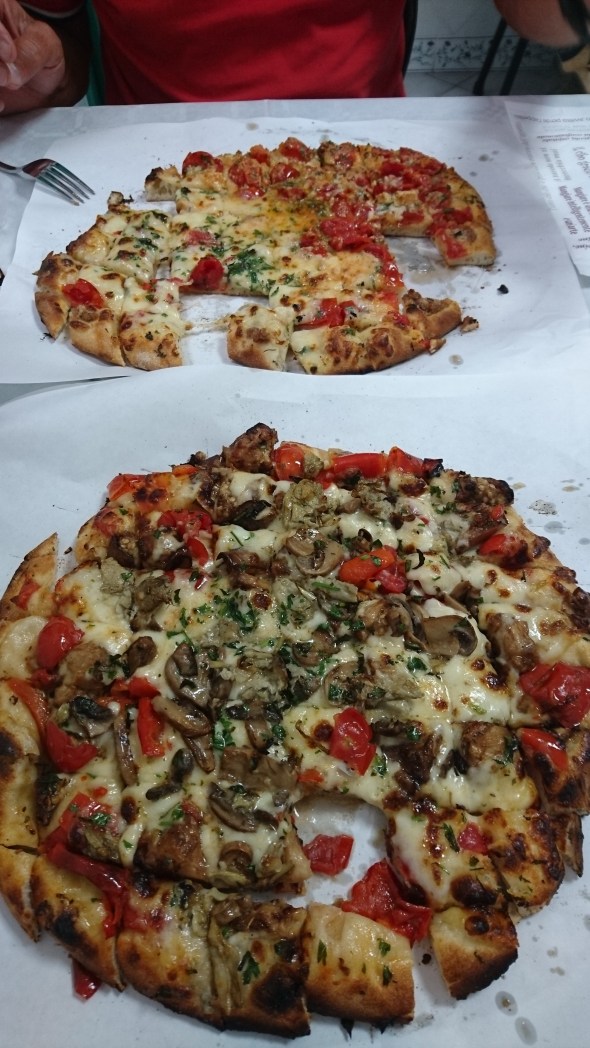 We eten in een pizzeria, die helemaal is ingesteld op snelheid, maar geen fastfood! Perfecte pizza, voorgesneden in hapklapbare brokken op je bord en keus uit meer dan 30 varianten in elk 3 verschillende formaten. Met wijn en water erbij 35euro. Je zit in kleine kamertjes met maar 3 tafels per kamer. Erg leuk, ook erg puur…..