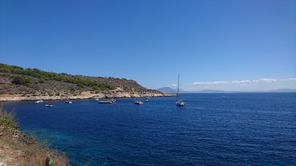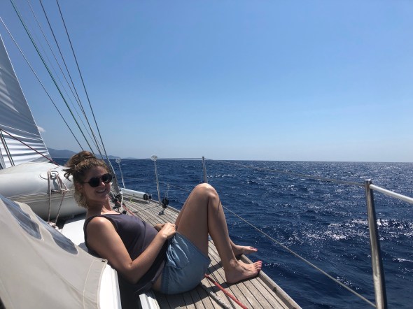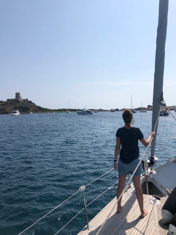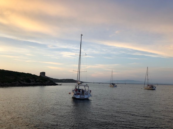 Eerst boodschappen doen, dan kruisen naar Villasimius, waar we ankeren aan de westkant, inmiddels een bekende plek. Met de dinghy naar de wal voor een CS en een aperol spritz voor Milou en een biertje voor Lennard. Weer een 8,5.