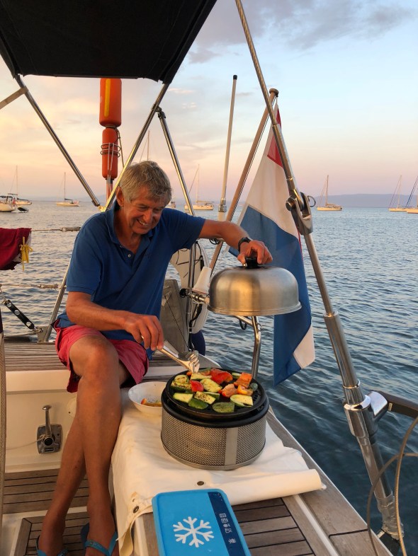 Daarna zeilen we naar Pula, waar we ook weer onder de ruïnes van Nora voor anker gaan op een bekend plekje. Ook hier weer een CS in de strandtent, die zeker ook een 8,5 verdient.