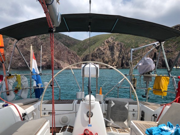 Na het ronden van de kaap die loodrecht uit de zee oprijst, varen we 2 mijl de baai in en kunnen daar weer een mooring pakken, na een eerdere mislukte ankerpoging in het wier. Hier liggen we heerlijk rustig met maar een paar boten in een heel ruime baai.