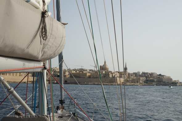 Na een paar uur draaien we en varen ruime wind terug. Lekker en snel, hele stukken boven de 9 knopen, zonder stroom. We ankeren in een kleine baai van Mellieha en zwemmen nog een keer om af te koelen voor we naar Valletta gaan. Daar is het zeker heel warm in de haven. We leggen om 17:30 aan in Msida. In de avond gaan we met de bus naar Valletta centrum en eten daar lekker , inclusief een goed ijsje.