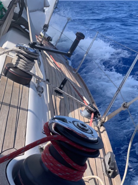 Na 30 mijl is de wind voldoende gedraaid en toegenomen tot 8-10 knopen om te kunnen zeilen. Hoog aan de wind lopen we er mooi doorheen op blak water met de G1, al snel 6,5-7,3 knopen.