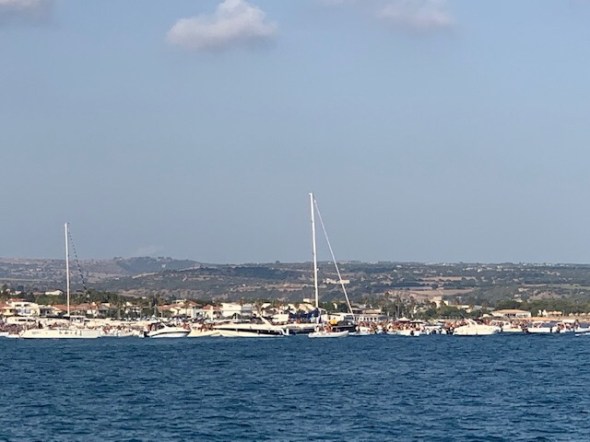 We zeilen ook nog een dagje langs de kust heen en weer naar Donnalucata. Ankeren en zwemmen voor we de haven weer invaren. Dat hadden anderen ook al bedacht, want er werd een openluchtconcert vanaf een geankerde X56 gegeven met enorme speakers in het want. Er lagen wel 40 of meer boten omheen voor anker. Wij lagen gelukkig een mijl of 2 verderop en hadden geen last van de boomboxen.