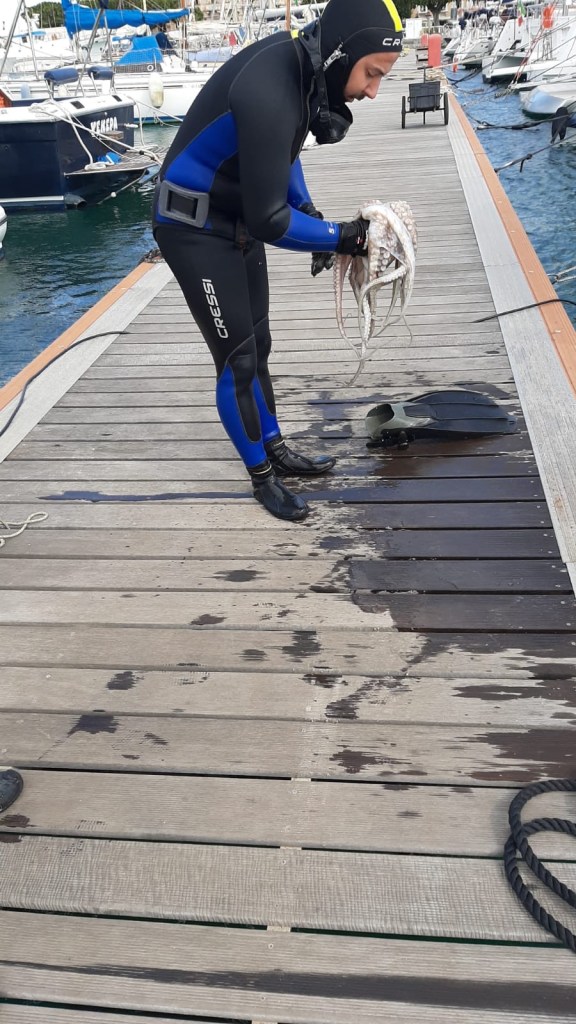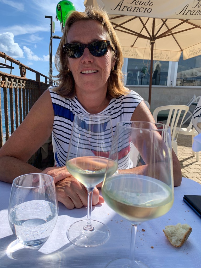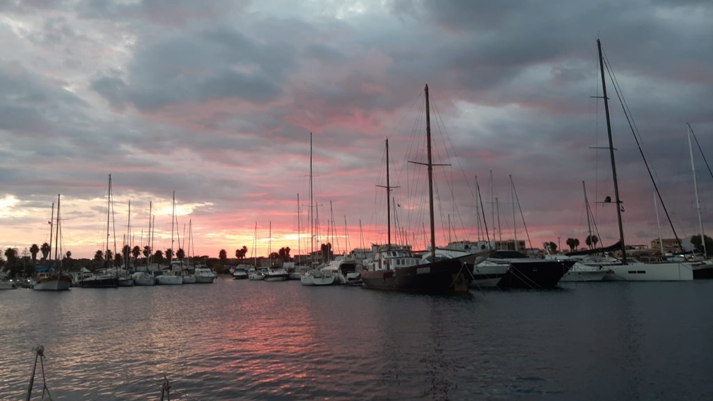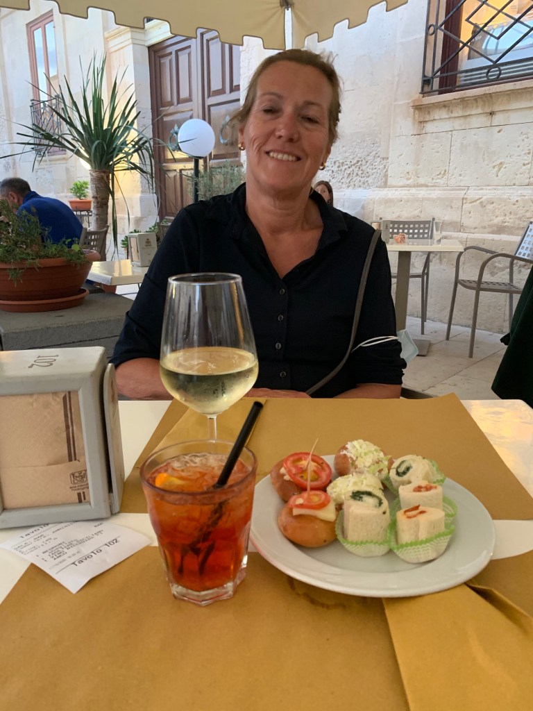 We liggen 4 dagen en 5 nachten in de haven van Siracusa, bij de oude stad (Ortigia). 2 daarvan zijn regenachtig, soms met onweer en de 2 andere dagen waait het echt hard ondanks stralende zon. Lui zijn, beetje klussen, een terrasje pikken voor een negroni sbagliato ( een soort turbospritz met campari, vermouth en prosecco) ;naar de vismarkt om verse zwaardvis en reuze gamba’s te scoren….we komen onze tijd wel door!