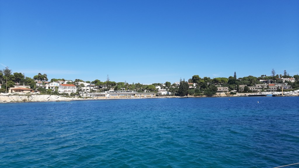 We varen om 9 uur de haven uit op zondag 11 oktober. Het is weer stralend weer, nog zonder wind. Maar die komt langzaam opzetten. Dus na een half uur zeilen we weer, nu weer halve wind over SB. De wind draait wel naar Zuidoost later dus ons ankerbaaitje Fontane Bianchi ligt aan lagerwal. Maar er is nog niet veel wind dus we ankeren om even lekker te zwemmen. Het water is nog 23,5 graden, dus heerlijk. We zien dat de aangroei verder meevalt. Kiel en roer zijn bijna aangroeivrij, maar die hadden we ook een extra laag antifouling gegeven in mei 2019.