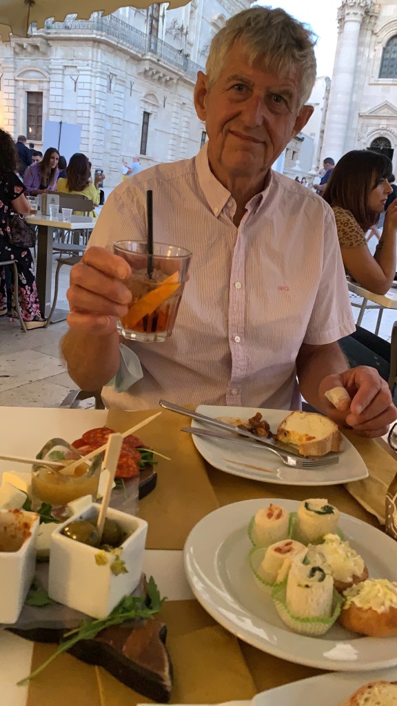 Na een uurtje trekt de wind toch wel aan, dus we gaan weer anker op. We lunchen wel zeilend. Om de kaap van Siracusa heen en de baai in, langs ons bekende terrasje in Ortigia waar iedereen komt om de zonsondergang te zien. We leggen aan bij Marina Yachting om 15:30 en lezen lekker lui in de warme middagzon in de kuip. We lopen op tijd de oude stad in maar de zonsondergang op het terras wordt niks. Te vol, geen tafels vrij. We lopen dus verder en belanden op het grote plein van de dom op een prima terras, waar we een wijntje (Marleen) en een Negroni sbagliato (Frans) drinken, dat laatste is een cocktail van campari, rode vermouth en prosecco, een soort turbo spritz dus. Erg lekker. Van Ilja Pfeiffer geleerd uit zijn boek Grand Hotel Europa. Met de hapjes erbij en de omgeving zeker een 9 waard.