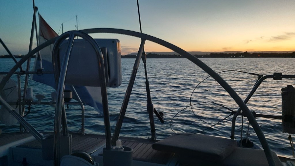 Frans zwemt een rondje boot, ook al is het water niet heel helder. We eten in de kuip en genieten van de zonsondergang en het uitzicht op Ortigia, de oude stad