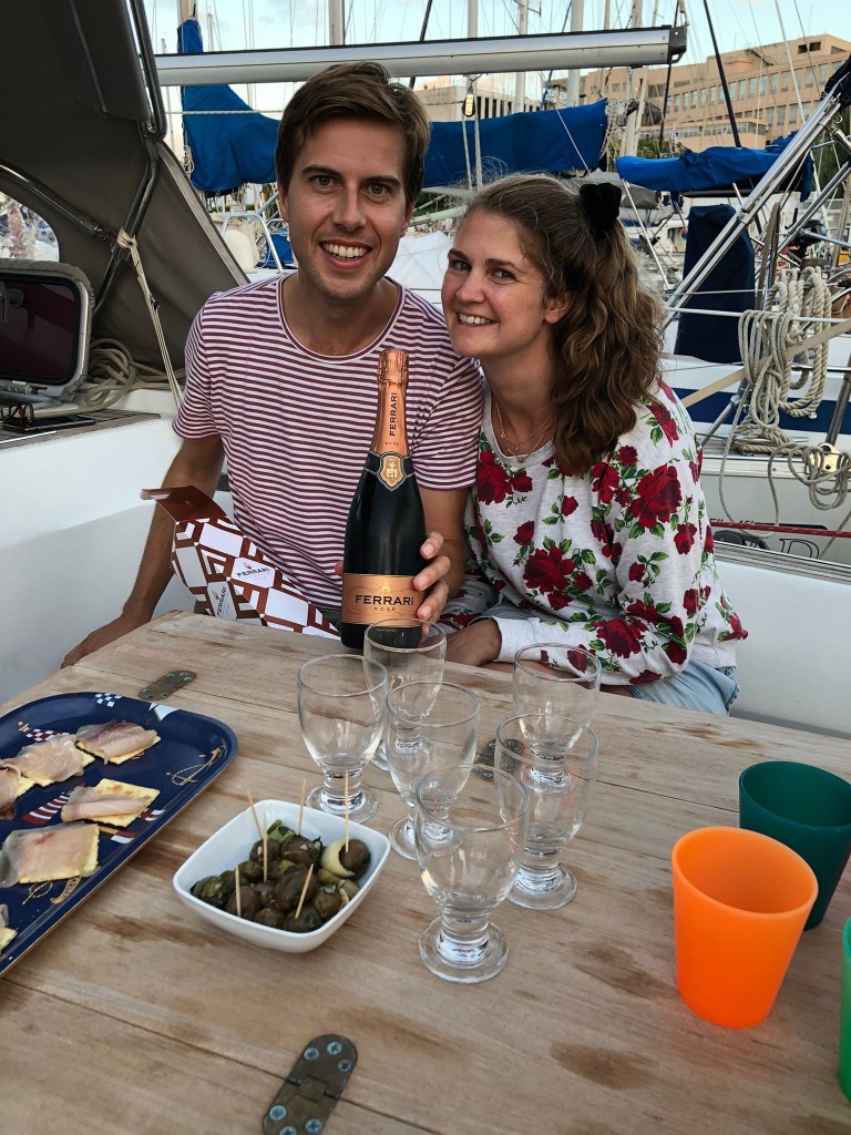 10 september komen Lennard en Milou met Theo en Aukje aan boord. Volle boot wel, maar het past allemaal prima en het is heel gezellig. We vieren het “voorgenomen huwelijk” van Milou en Lennard met een fles Ferrari Rosato in de Kuip. Feestelijk en met mooie ideeën voor het huwelijk volgend jaar.