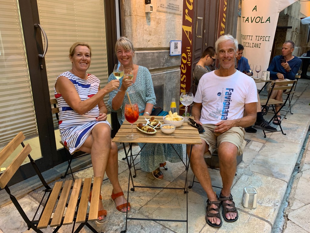 Veel campari spritzen, wijntjes en een enkele gin tonic op terrassen op alle bestemmingen gedronken en veel vis gegeten. Een week volop genieten dus. De laatste avond in Mazara del Vallo eten we heerlijk op een terras in het oude stadje om de week af te sluiten en drinken we een mooie Zibibo uit de streek.