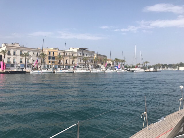 We leggen aan de stadskade aan, vlak bij de colonna die het einde van de via Appia markeert. We wandelen een rondje en bewonderen de Giro d’Italia di Vela, een mooi gesponsored evenement waarop we bij het invaren van de grote havenmond al werden dewezen door de boot van de Guardia di Finanza. Leuk om weer terug te zijn hier.
