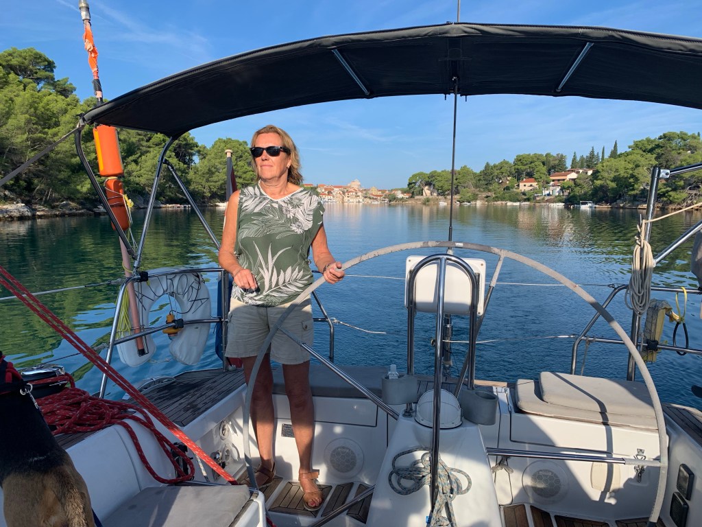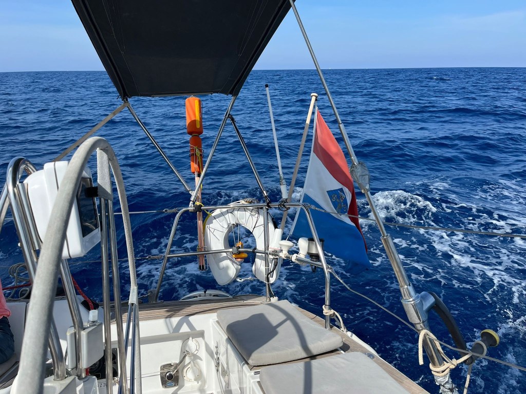 De wind en de zee zijn knap onrustig als we wegvaren, dus 2 reven in het grootzeil en half ingerolde genua. We lopen alsnog rustig 7,5-7,7 knopen omdat we halve wind naar het noordoosten kunnen sturen. Na 25 mijl is het op met de wind, zoals voorspeld door predictwind en meteoconsult. Motoren dus maar weer. Als we de eilanden van Kroatië in zicht krijgen, komt de wind zoals verwacht wel weer terug uit het noordwesten maar te weinig om goede voortgang te maken, dus de motor blijft zachtjes bij.