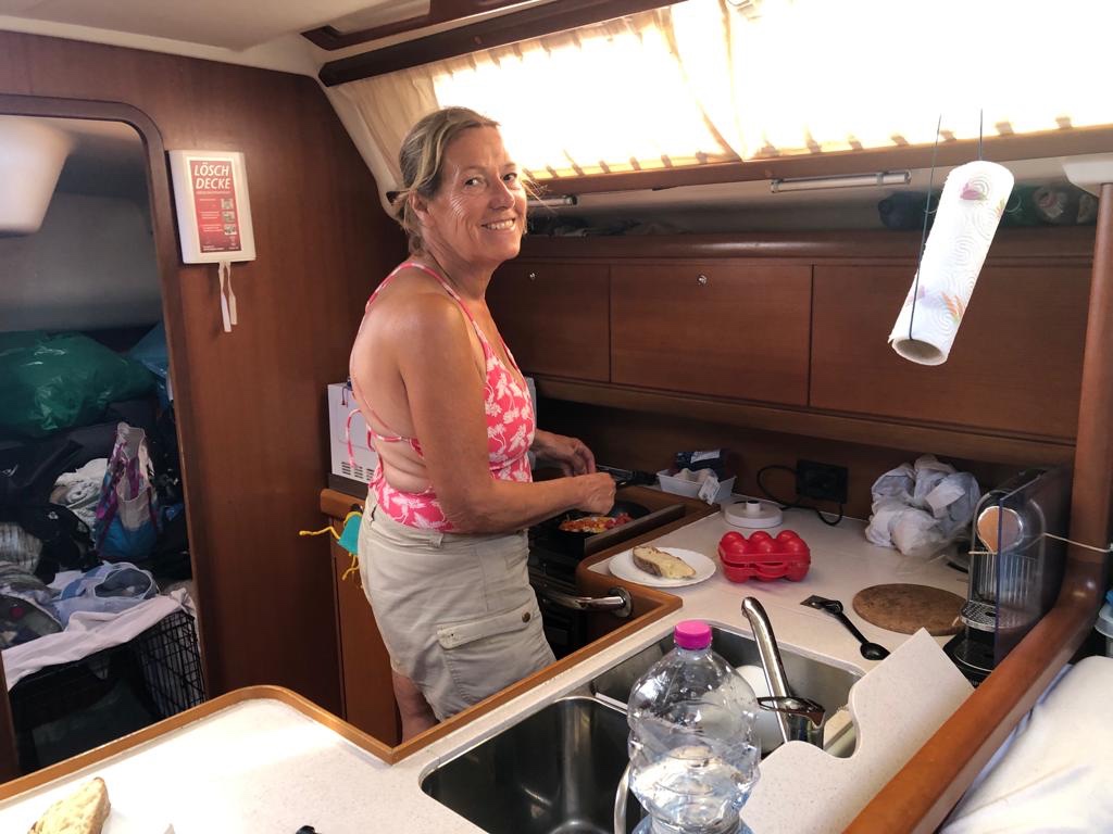 Zij hielpen bij het halve wind aanleggen wat wel prettig was bij 17-19 knopen wind. Daarna heeft Alessandro ons geholpen met diesel tanken met jerrycans in zijn bootje, 3 keer heen en weer. Nu kunnen we wel weer even vooruit.