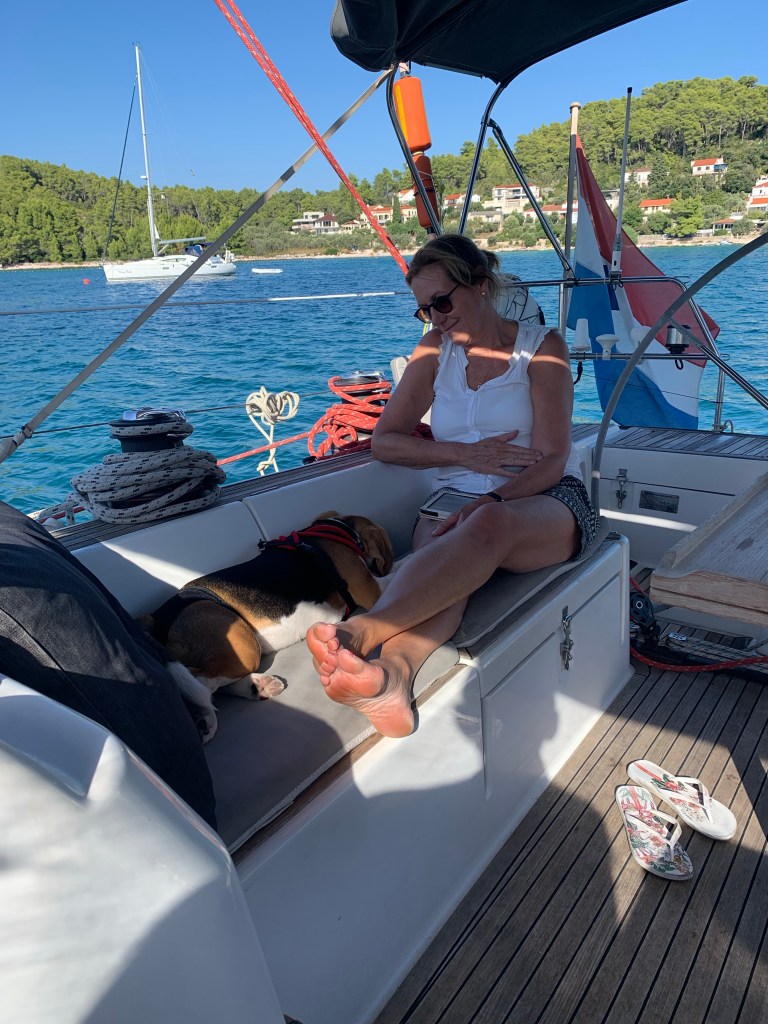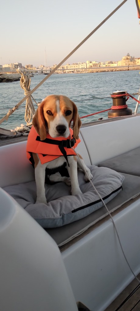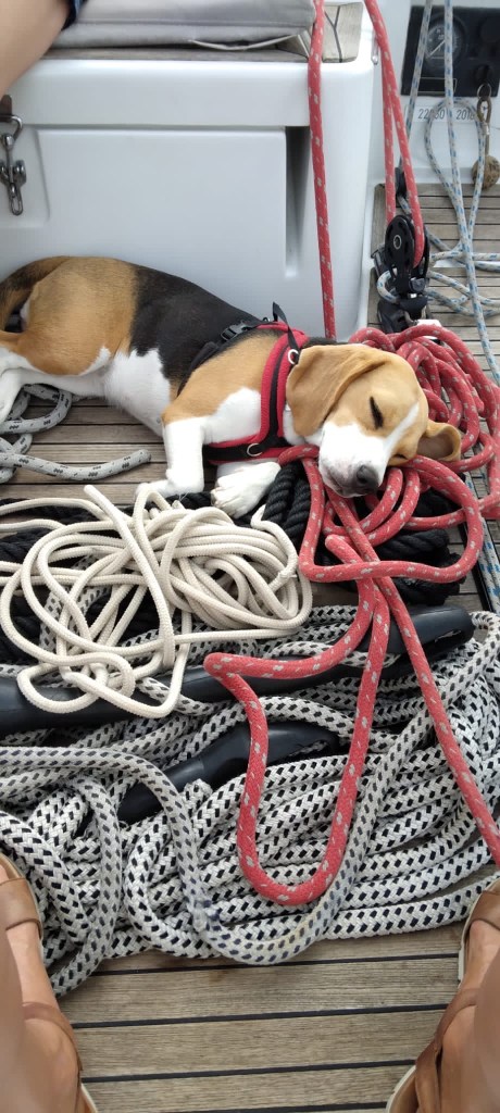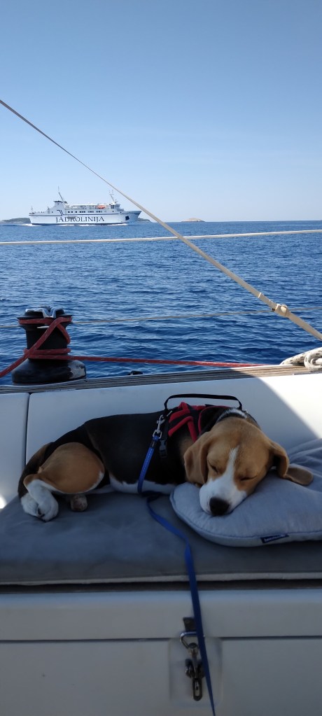 Na 2 nachten in Brindisi marina gaan we de Adriatische zee op. Het wordt motoren want de lichte wind is 20 graden van voren. Rustige start dus. Ook voor Charlie die meer dan de halve reis ligt te slapen.