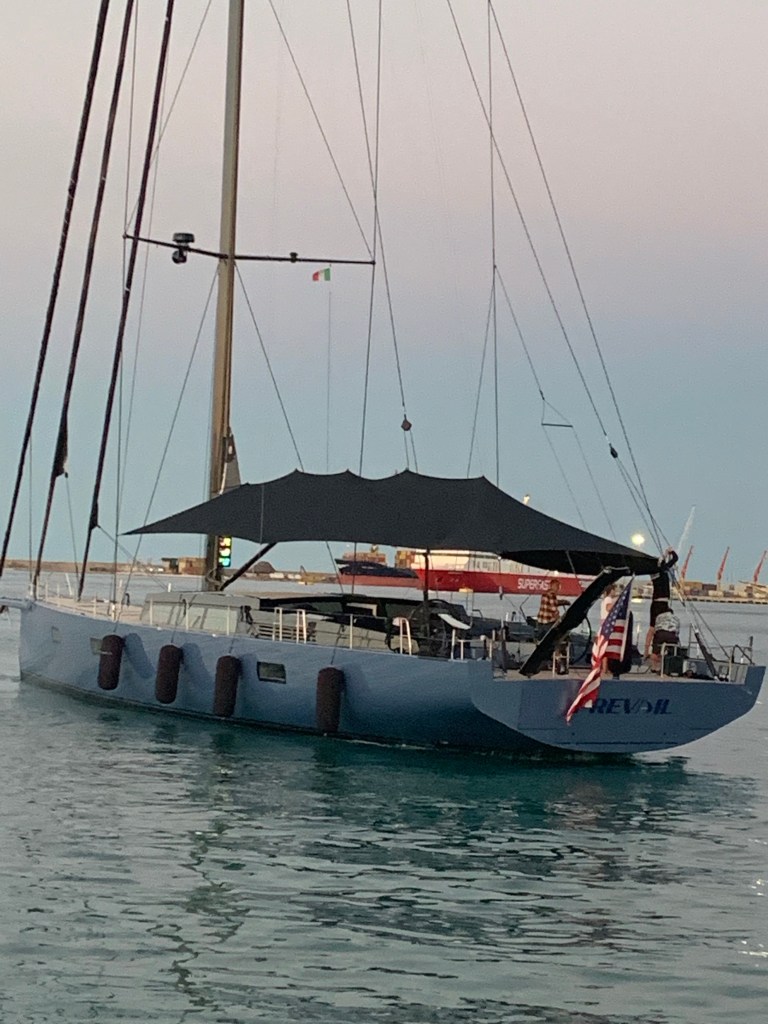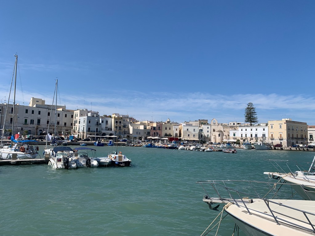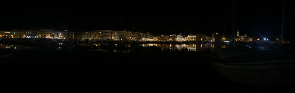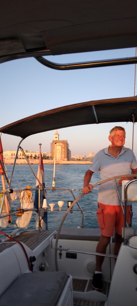 Luigi regelt weer een mooie plek voor ons bij de haven van de gemeente, die niet direct te benaderen is. We gaan hier 4 dagen blijven wat het gaat echt hard waaien, 35-40 knopen uit het noorden. Maar Trani is wel een leuke plek om dat te doorstaan. We liggen aan de lijzijde van de steiger in de luwte van een grote motorboot (gin palace) dus relatief rustig. In de avond is het trouwens ook nog helemaal kalm, nauwelijks wind.