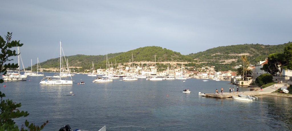 We hebben afgesproken op Hvar, het volgende eiland, in de haven van Starigrad waar hun veerboot vanuit Split aanlegt. Leuk stadje met een drukke marina maar er is genoeg plek. Sinds 2007, toen we hier ook waren, is er veel uitgebreid maar het blijft een mooi plaatsje. We eten een ijsje, drinken een CS op het terras en praten uitgebreid bij.