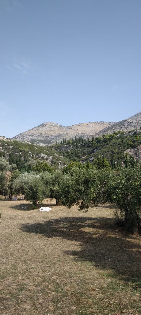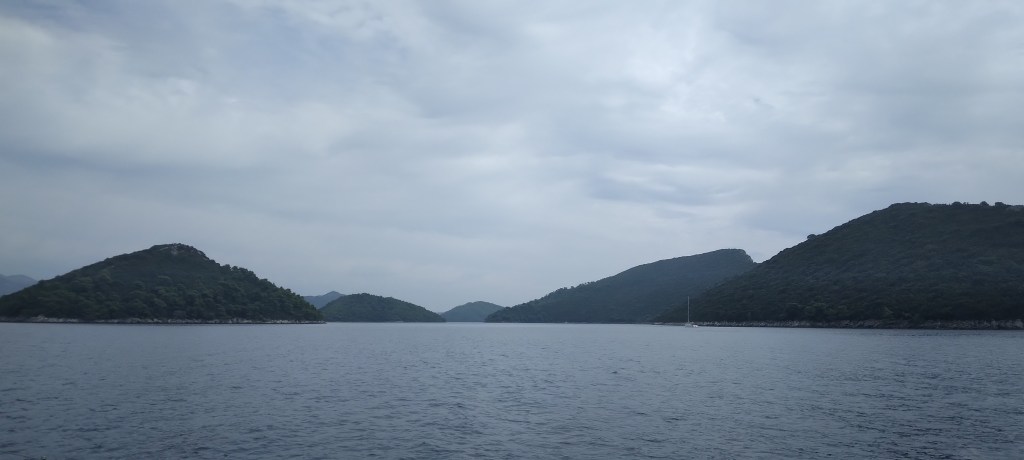 We tuffen de 21 mijl naar Slano in bijna windstil weer onder een grijze hemel. We varen tussen het vasteland en het mooie eiland Mljet door.