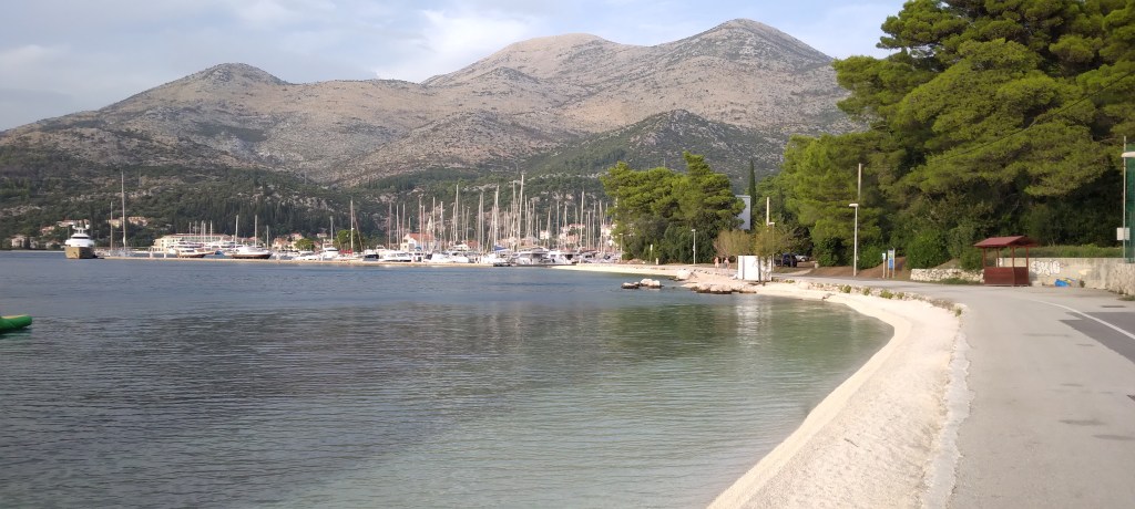 Daarna varen we tussen het vasteland en weer een nieuw eilandje en dan zien we in de verte de ingang naar de baai van Slano. Deze baai ligt heel beschut en de ACI Marina ligt ook nog eens aan hogerwal voor de zuidoosten wind die gaat komen. We schuilen hier 5 dagen,maar dat is geen straf. De haven is mooi, er is een zwembad bij en we wandelen wat langs de kust. Gelukkig niet teveel regen en ook flink wat zon maar wel veel wind.