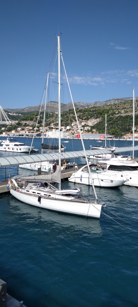 De laatste 13 mijl vanaf Slano gaan op de motor (alweer….). Er is geen wind als we vertrekken maar bij het invaren van de baai van Dubrovnik waait het meer dan 20 knopen. Dat is gelukkig bij de haven minder maar we zijn wel blij met goede mooringmen, die eerst de mooring lijn aan loef aangeven en direct de achterlijn aan loef beleggen.