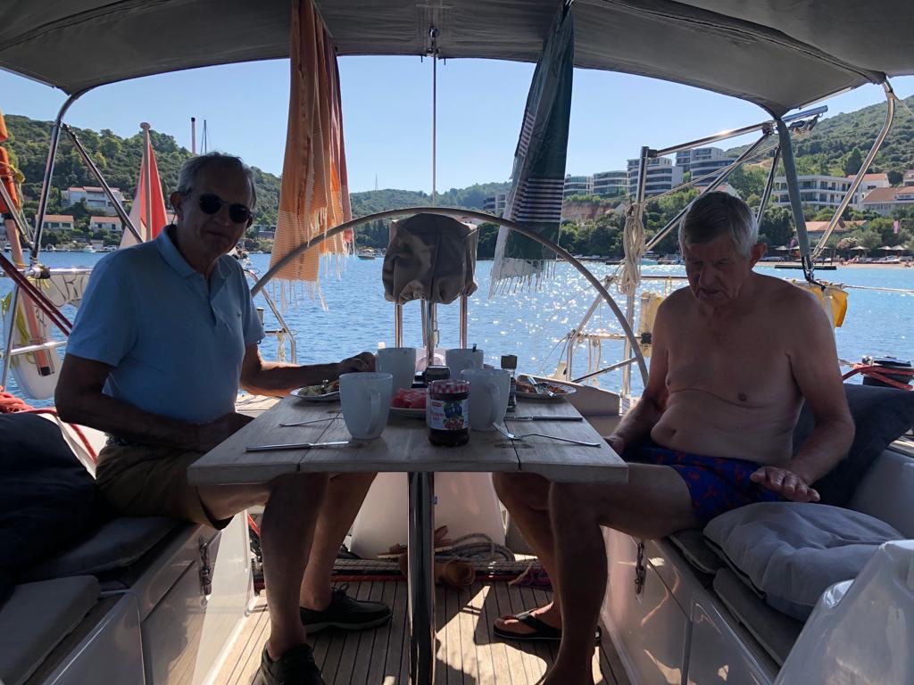 Om de goede afloop van met name het “inklaren” te vieren, eten we een risotto met zeevruchten op het terras met zicht op de baai. Daarna vroeg naar bed. Ook Charlie was doodmoe.