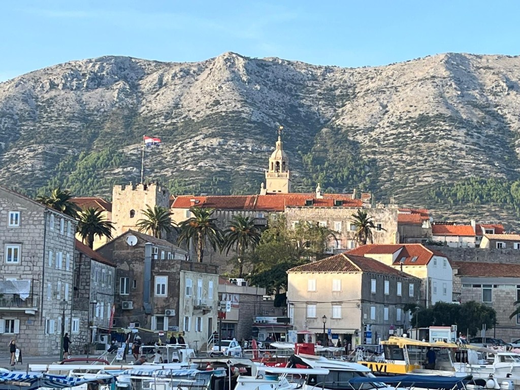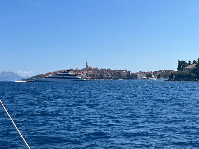 Nog 2,5 mijl varen is het vanuit onze rustige baai naar het mooie en drukke stadje Korcula, waar we in de marina een mooi plekje krijgen.