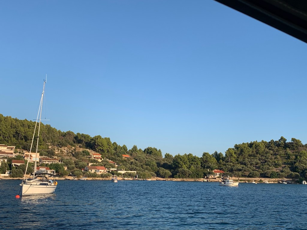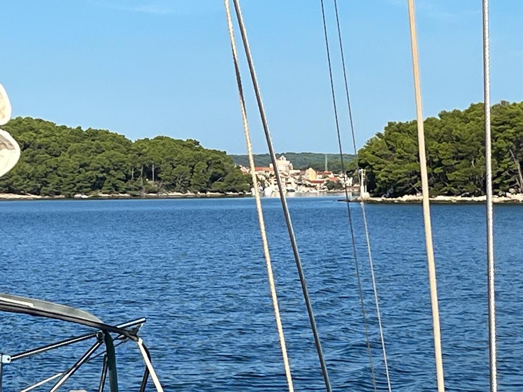 We zeilen 3/4 van de oversteek naar Hvar maar dan moet de motor weer bij. Daarna om de noordpunt van Hvar naar Vrboska, een wat verstild plaatsje aan het einde van een soort fjord. Het doet wel wat denken aan de Zweedse scherenkust.