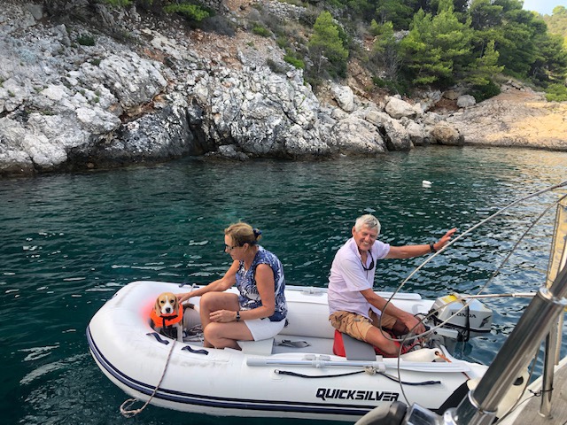 Het lijkt net de Carieb in deze baai met mooie huizen, een restaurant en een strandje. We nemen Charlie mee in de rubberboot naar de wal, wat ze prima vindt