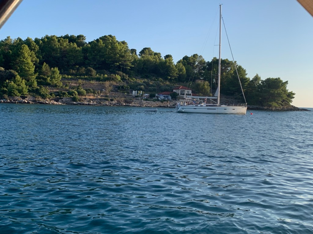 De volgende dag zwemmen in zee bij het strand naast de haven. Daarna tuffen we naar Gravina, een mooie baai met moorings bij Veja Luka op de westpunt van het eiland Korcula.