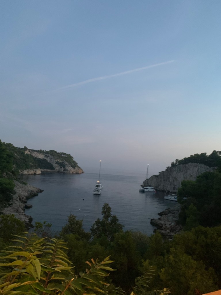 We varen 17 mijl, waarvan 15 op de motor. Om 15:30 komen we in de baai aan waar we een plek hebben gereserveerd. Je ligt aan een mooring lijn voor en een lijn aan de rots achter.