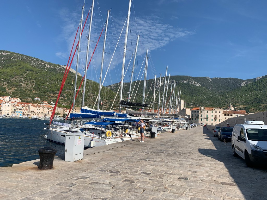 We zeilen hoog aan de wind naar Vis, 18 mijl. We moeten daar vroeg zijn om een plekje te bemachtigen aan de kade van het dorpje Kuta. Erg leuk om hier weer te zijn, nu met onze eigen GS45 en niet met de Matterhorn die we in 2007 huurden toen er WK Splash was in Split. Na die wedstrijden zeilden we toen een week rond met 4 boten; Jan Willem en Patricia huurden toen een Salona 37 en wij een GS 45 om eens te testen.