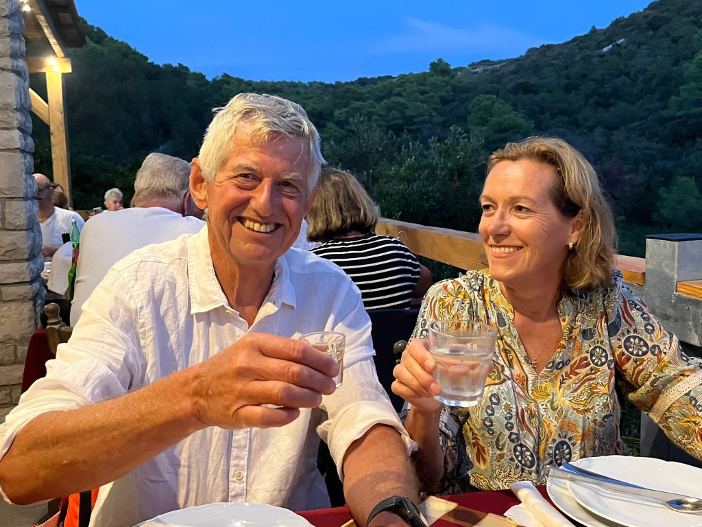 Het is een leuke baai waar we aan een mooring gaan liggen van het restaurant. We gaan er eten en Patricia en Jan Willem trakteren ons. Heerlijke vis met lokale witte wijn.