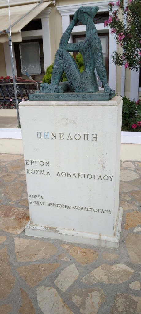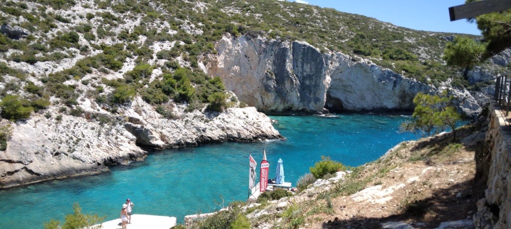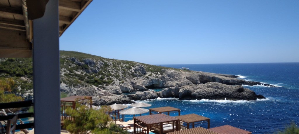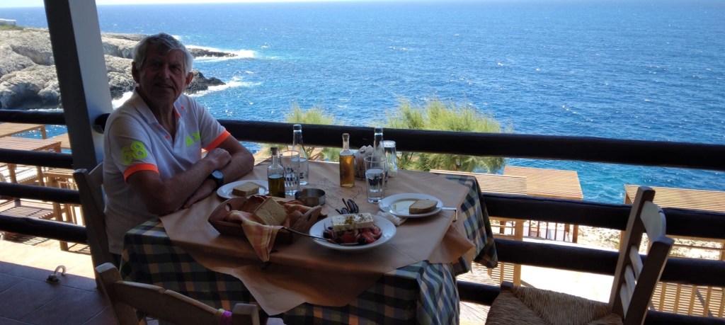 We rijden ongeveer het hele eiland rond. Langs de oostkust te noorden van de stad is het een soort Torremolinos, veel stranden, goedkope tavernas en veel mensen. In de bergen aan de noordpunt zijn wat kleine dorpjes maar die zijn duidelijk niet in de economische groei meegekomen. Het ziet er niet welvarend uit en er is weinig te zien. Verder naar het zuiden komen we langs een goede olijfpers in een dorpje dat er leuker uit ziet. We proeven en kopen olie voor thuis en voor aan boord. Vivi, die ons helpt, wijst ons de weg naar de beste strandtent voor de lunch, in Liminioki baai. Het weggetje erheen is 10 kilometer lang en supersteil naar beneden. We genieten van de mooie uitzichtpunten. We melden in de taverna bij Ioannis dat Vivi ons heeft gestuurd dus we krijgen een heel mooi tafeltje met zicht op de kliffen en de zee. En we eten inderdaad heerlijk.