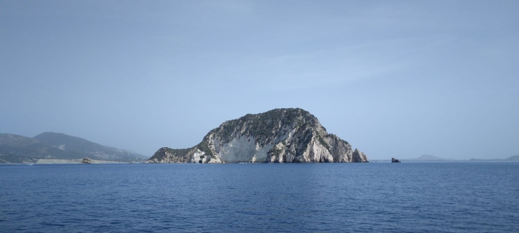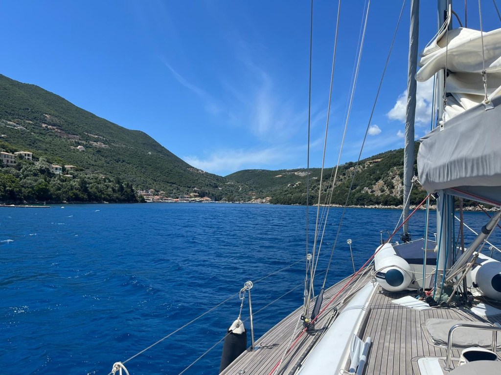 Eenmaal onder de luwte van het eiland uit, neemt de wind toe en ruimt zodat we halve wind onder vol tuig naar Ithaka zeilen met een boot snelheid van 7,5-8,9 knopen. Heerlijk tochtje in de volle zon.
